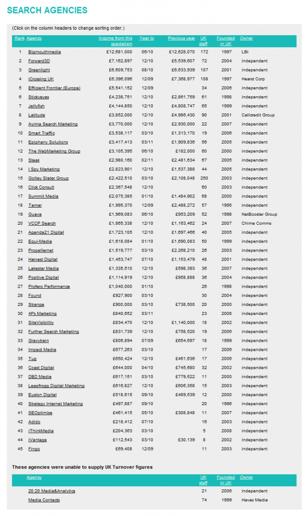 The biggest loser in this year’s list seems to be Latitude with a loss of over £1,000,000 in turnover YOY, with fellow agencies iCrossingUK and Propellernet also seeing significant losses. Looking at the other end of the scale the biggest winners are Smart-Traffic with an increase of over £2,000,000 whilst Forward3D & Epiphany Solutions also saw huge increases.
